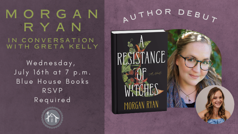 Join Morgan Ryan, debut author of “A Resistance of Witches” on Wednesday, July 16th at 7pm at Blue House Books as she discusses her historical witchy novel with local fantasy author, Greta Kelly!