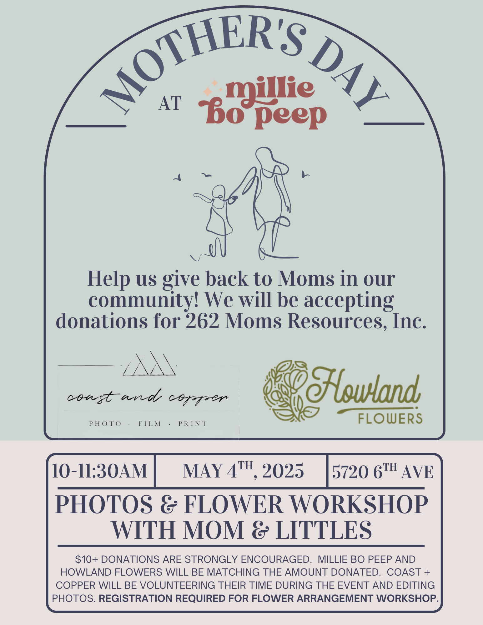 Let's celebrate all moms - while giving back to other Moms right here in our own community! Join us on Sunday, May 4th from 10-11:30am for: 📸 Professional photos for moms & their littles with Coast + Copper 💐 Flower workshop arrangement for moms & littles with Howland Flowers. Registration is required to participate in...