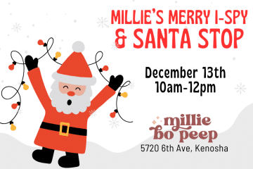 Millie Bo Beep 5720 6th Avenue, Kenosha, WI, United States🎅✨ Millie’s Merry I-Spy & Santa Stop! ✨🎅 December 13th | 10am–12pm Millie Bo Peep — 5720 6th Ave, Kenosha Get ready for a magical morning at Millie Bo Peep! Bring the kiddos for a festive I-Spy adventure throughout the shop. We’ll have holiday-themed items hidden around the store—can you spot them all? 🎄 Complete...
