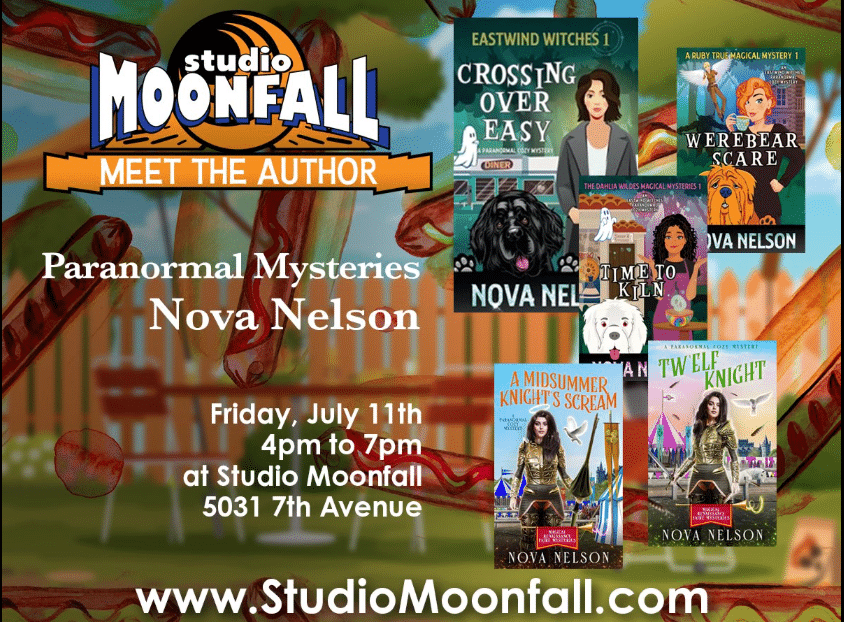 Visit us on Friday, July 11, 2025 at Studio Moonfall from 4pm to 7pm to meet Mystery Author, Nova Nelson.