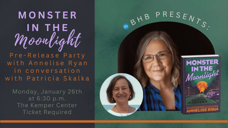 Join Annelise Ryan at the Kemper Center on Monday, January 26th, at 6:30 p.m. as she kicks of her book tour for hew newest release, “Monster in the Moonlight”. Event attendees will get access to the newest Monster Hunter Mystery the day before it officially releases! Annelise will be discussing her latest book with fellow Wisconsin author Patricia Skalka (the Dave Cubiak Door County Mystery series), answering questions from the audience, and signing books!