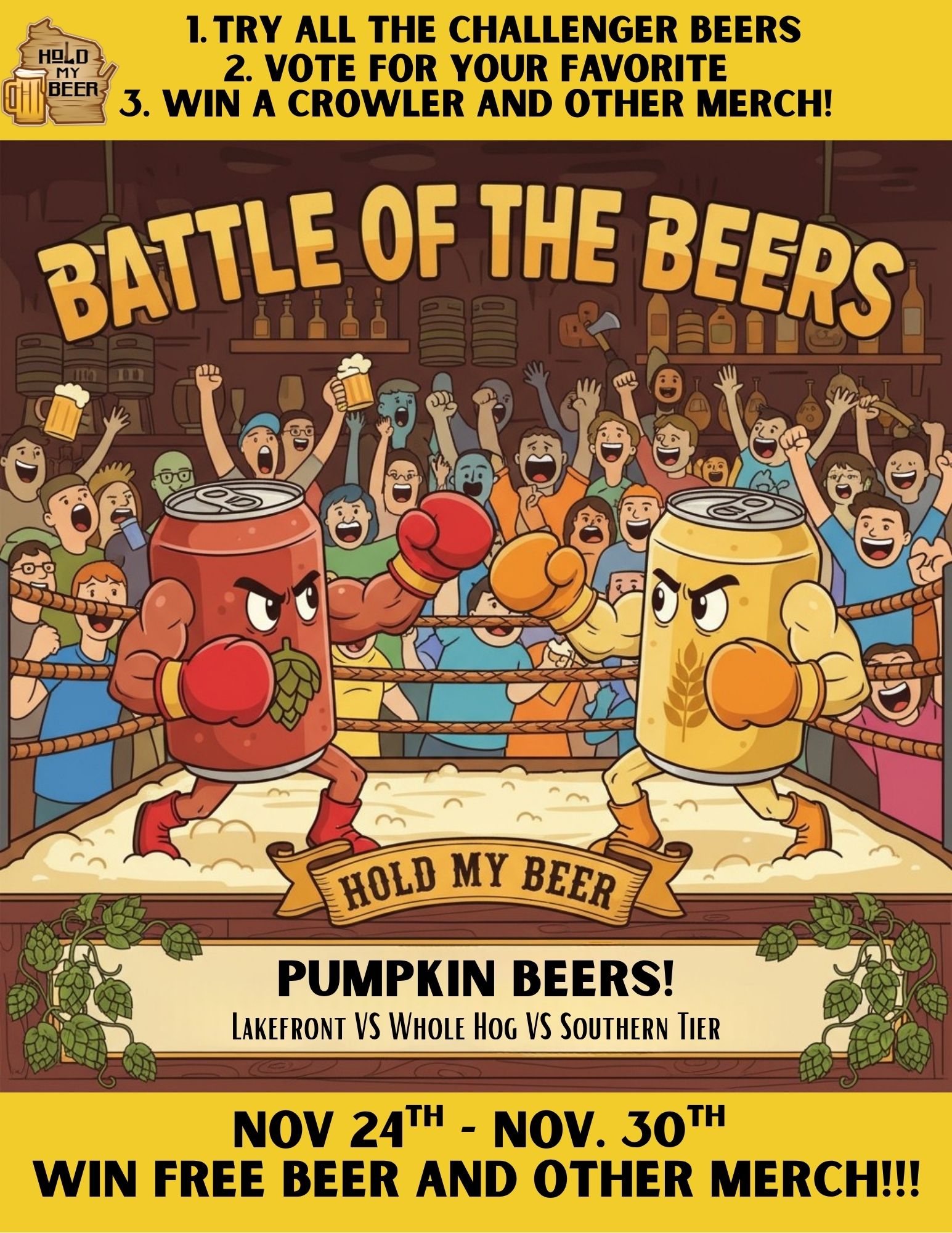 Are you ready to rummmmmble!?! Join us for battle of the beers! Stop in any time from Nov 24th-30th, try the incredible beers, vote for your favorite, and you'll be entered to win a free crowler full of beer and other great prizes! It's that simple. Come have some fun, and discover new favorites!