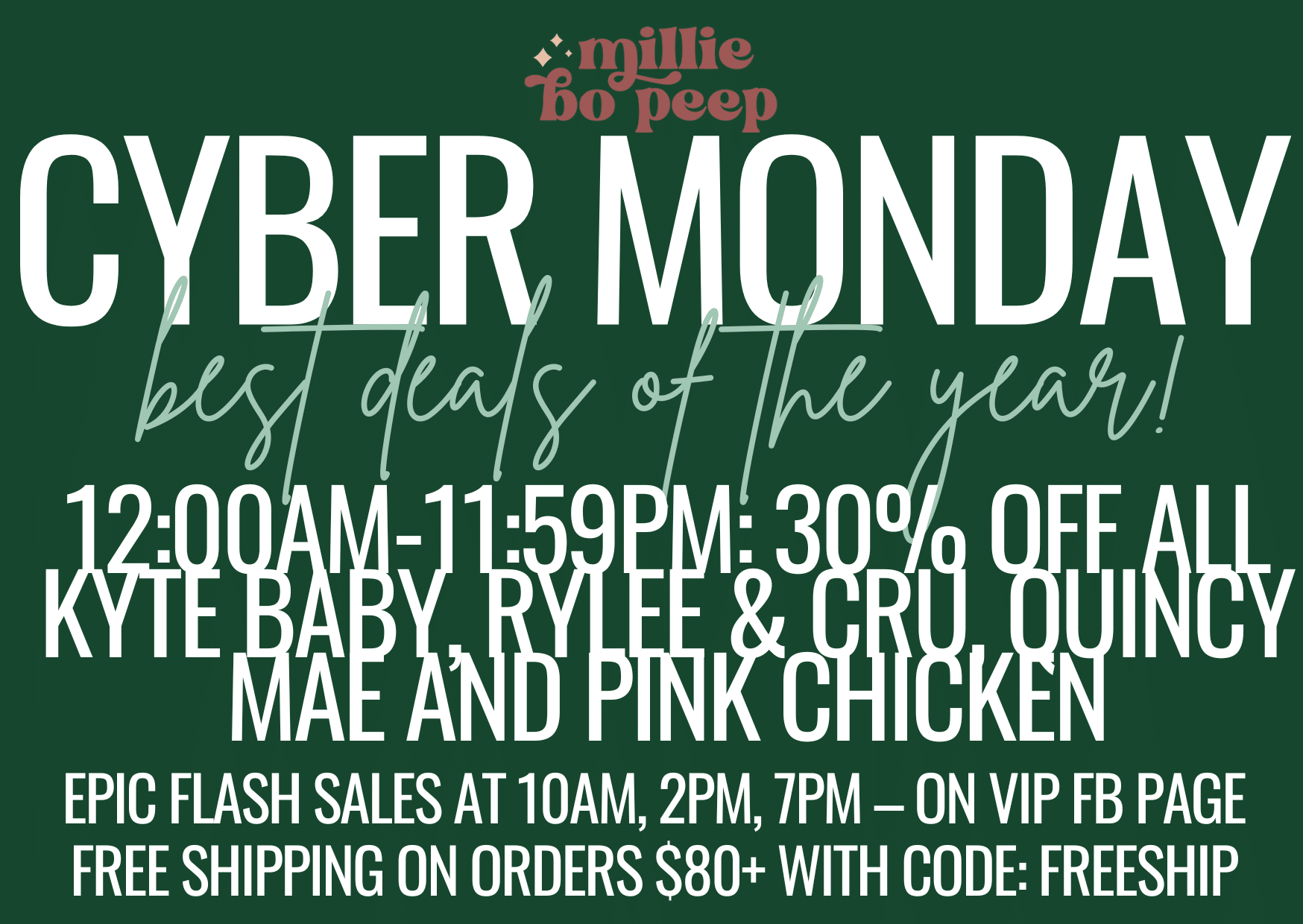 CYBER MONDAY ✨MONDAY, 12/1 — 12AM-11:59PM — online only 30% off all Kyte Baby, Rylee and Cru, Quincy Mae and Pink Chicken! Epic Flash Sales — 10AM, 2PM, 7PM **Watch our Facebook VIP page** Free Shipping on orders $80+ for VIP customers