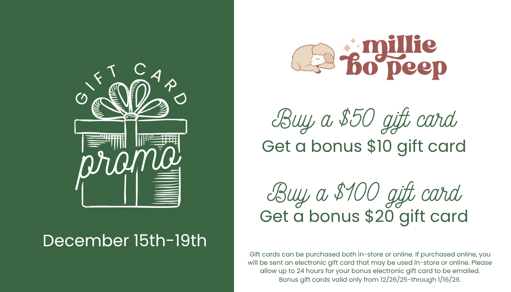 Shop with Millie Bo Peep December 15th-19th. Purchase a $50 gift card, and get a $10 bonus card back. Purchase a $100 gift card and earn a $20 bonus gift card back. Bonus gift cards are valid for use December 26th-January 16th.