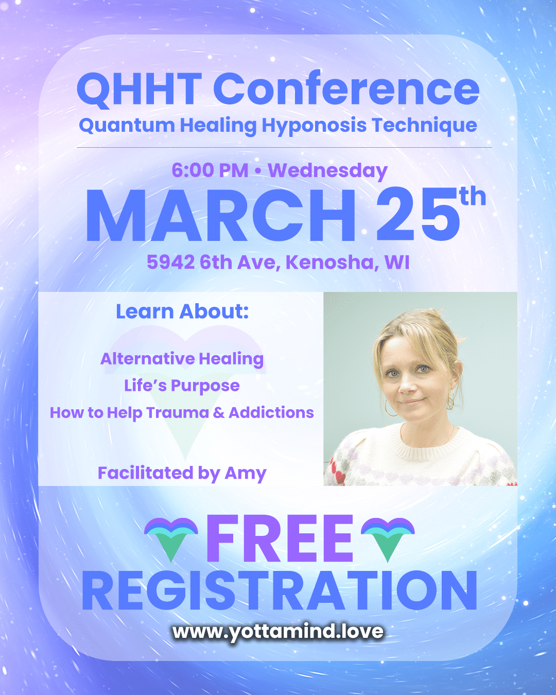 Are you wanting to learn about alternative healing? Would you like to learn how to heal from trauma, addictions, or break old patterns? Are you someone who likes to explore consciousness and find your life’s purpose? Join us at our FREE Quantum Healing Hypnosis Technique (QHHT) Conference! Yottamind’s Level 2 QHHT Practitioner, Amy, will go over what QHHT is, how it works, and how it can help you. Please register through the Yottamind website (yottamind.love) to secure your spot. Limited seating available.