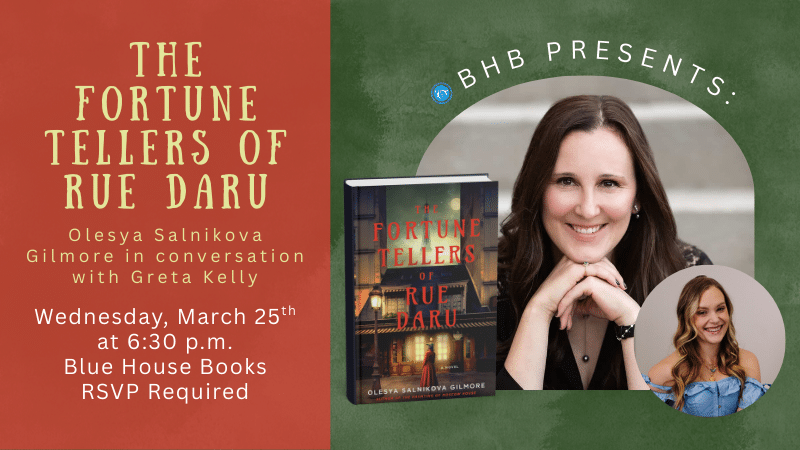 A fearless fortune teller in 1920s Paris must use her powers to divine who she can trust—and even more importantly, learn to trust herself—in the searing new gothic novel from the author of "The Haunting of Moscow House". Join Olesya Salnikova Gilmore at Blue House Books on Wednesday, March 25th at 6:30 p.m. to discuss...