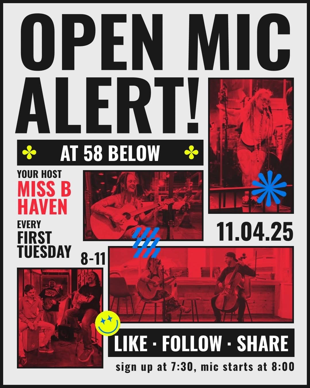 Hey you: your first Tuesday open mic nights are shifting over to your favorite underground bar in downtown Kenosha - 58 Below! I’ll have a full drum kit on stage & PA system! (Yes we can plug in your “aux” for tracks!) 8-11 pm we will be downstairs flooding the stage with all the groovy...